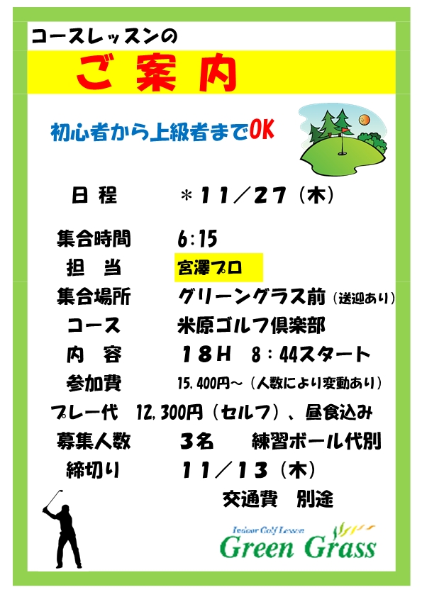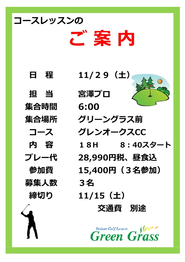 ③11月のラウンドレッスン⛳参加者募集!!(10/29更新) 2025/10/29 いつもグリーングラスをご利用いただきましてありがとうございます。 11月は2回ほど、18Hでのラウンドレッスン⛳を開催いたします! ご都合がよろしければ、是非ご参加下さいませ🎵 11月27日(木)満員御礼となりました。 ありがとうございます!! 11月29日(土)は、残り1名様です! ★ご希望の方は、お早めにフロントまで★ 共有:クリックして Twitter で共有 (新しいウィンドウで開きます)Facebook で共有 (新しいウィンドウで開きます)クリックして Google+ で共有 (新しいウィンドウで開きます) 関連