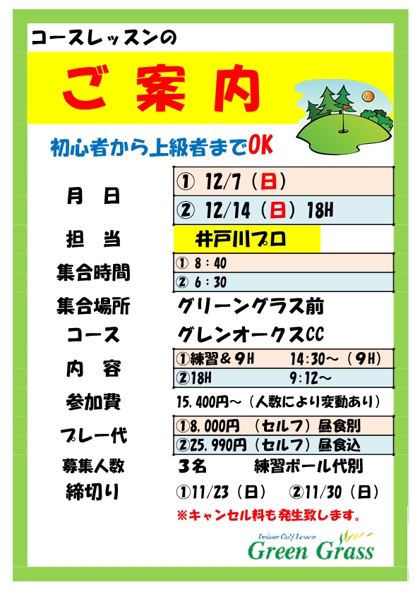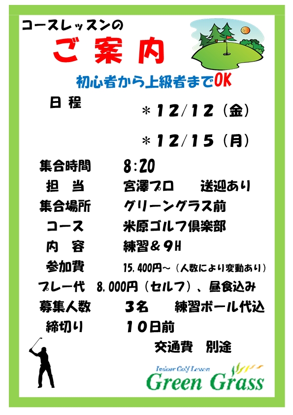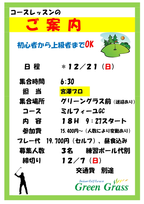 12月のラウンドレッスン⛳参加者募集!! 2025/11/07 いつもグリーングラスをご利用いただきましてありがとうございます。 12月はみなさん忙しいとは思いますが、 ご都合がよろしければ、是非ご参加下さいませ🎵 ★ご希望の方は、お早めにフロントまで★ 共有:クリックして Twitter で共有 (新しいウィンドウで開きます)Facebook で共有 (新しいウィンドウで開きます)クリックして Google+ で共有 (新しいウィンドウで開きます) 関連