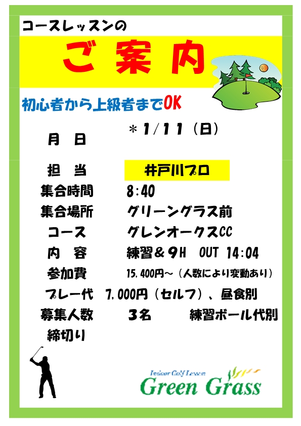 2026年1月のラウンドレッスン⛳参加者募集!!(12/23更新) 2025/12/23 いつもグリーングラスをご利用いただきましてありがとうございます。 冬にあるある、芝の薄い所からのショットは難しいですよね ラウンドレッスンでのその攻略方法を学ぼう ★ご希望の方は、お早めにフロントまで★ 井戸川プロのラウンドレッスンの参加者を募集します。(12/15更新) 1月11日(日)のラウンドレッスンは満員御礼となりました。 ありがとうございます! 1/4(日)のラウンドレッスンは満員御礼となりました。 ありがとうございます!! 共有:クリックして Twitter で共有 (新しいウィンドウで開きます)Facebook で共有 (新しいウィンドウで開きます)クリックして Google+ で共有 (新しいウィンドウで開きます) 関連