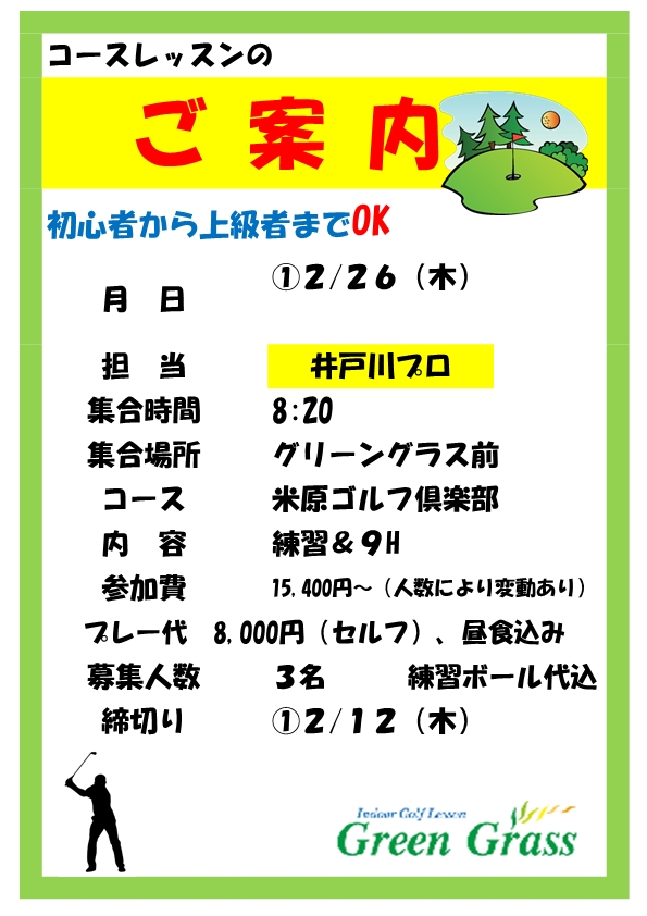 ①2月のラウンドレッスン⛳参加者募集!!(1/29更新) 2026/01/30 いつもグリーングラスをご利用いただきましてありがとうございます。 2月は寒いからゴルフは無理と思っていませんか? 今は高性能のウェアやカイロのお陰で意外と暖かいんですよ 冬のゴルフは、体も気持ちも引き締まって良いかも ★ご希望の方は、お早めにフロントまで★ 井戸川プロのラウンドレッスン追加(1/29更新) 宮澤プロのラウンドレッスン追加(1/15更新) 共有:クリックして Twitter で共有 (新しいウィンドウで開きます)Facebook で共有 (新しいウィンドウで開きます)クリックして Google+ で共有 (新しいウィンドウで開きます) 関連