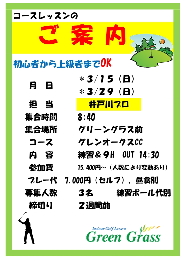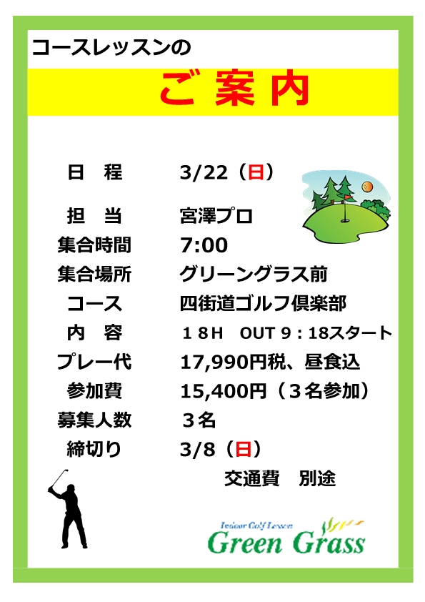 ①3月のラウンドレッスン⛳参加者募集!! 2026/02/20 いつもグリーングラスをご利用いただきましてありがとうございます。 梅も咲き、春まであとちょっと。 芝はまだ緑色ではないけれど、暑くなく、寒くなく、 3月のゴルフはオススメですよ。 ゴルフシーズンに向けて、ラウンドレッスンで腕を磨こう! ★ご希望の方は、お早めにフロントまで★ 共有:クリックして Twitter で共有 (新しいウィンドウで開きます)Facebook で共有 (新しいウィンドウで開きます)クリックして Google+ で共有 (新しいウィンドウで開きます) 関連