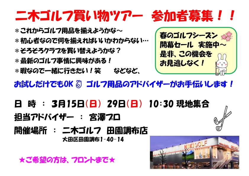 二木ゴルフ買い物ツアー 参加者募集~🎵 2026/03/07 いつもグリーングラスをご利用いただきましてありがとうございます。 3月15日(日)29日(日)に二木ゴルフ買い物ツアーを予定しております! 今回も宮澤プロがアテンドして下さいます😊 初心者の方はサポートいたしますので、ご安心ください。 経験者の方は、ギアの見直しをするのもいいのでは? 春のゴルフシーズンに向けて、自分に合うクラブを見つけよう! ご興味がある方、是非ご参加下さいませ~🎵 ★ご希望の方は、フロントまで★ 共有:クリックして Twitter で共有 (新しいウィンドウで開きます)Facebook で共有 (新しいウィンドウで開きます)クリックして Google+ で共有 (新しいウィンドウで開きます) 関連
