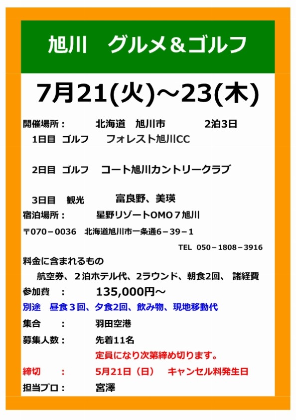 旭川 グルメ&ゴルフツアー 参加者募集中!(4/17訂正有) 2026/04/17 いつもグリーングラスをご利用いただきましてありがとうございます。 【グルメ&ゴルフツアー】の第3弾! 場所は北海道 旭川 旭川グルメと言えば、ジンギスカンにビール、旭川ラーメン 個人的には「ジュンドッグ」食べてみたいなぁ~ 残り3名(4/8) 会員様以外でもご参加可能です。 ご友人・知人、皆様お誘い合わせの上、ふるってご参加下さいませ。 共有:クリックして Twitter で共有 (新しいウィンドウで開きます)Facebook で共有 (新しいウィンドウで開きます)クリックして Google+ で共有 (新しいウィンドウで開きます) 関連