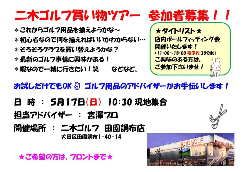二木ゴルフ買い物ツアー 参加者募集~🎵 2026/04/24 いつもグリーングラスをご利用いただきましてありがとうございます。 5月17日(日)二木ゴルフ買い物ツアーを開催いたします! 今回も宮澤プロがアテンドして下さいます😊 初心者の方はサポートいたしますので、ご安心ください。 経験者の方は、ギアの見直しをするのもいいのでは? 当日は、タイトリストの店内ボールフィッティング会も開催されます。ご興味のある方は、是非この機会にご参加下さいませ。 ★ご希望の方は、フロントまで★ 共有:クリックして Twitter で共有 (新しいウィンドウで開きます)Facebook で共有 (新しいウィンドウで開きます)クリックして Google+ で共有 (新しいウィンドウで開きます) 関連